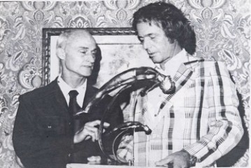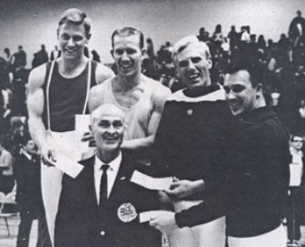 What could you expect? Nissen asked a Newsweek reporter. "You have to have programs. I bounce myself, but if I didn't have something new to do on a trampoline, I would lose interest." Although he didn't say so at the time, Nissen was beginning to think a lot about how to sustain a broad-based, long-term interest in trampolining. "If you've got 50 kids out there on trampolines, well, after a couple of weeks 25 of them are going to be better than the other 25. And the ones that are not so good at it drop out. Later you'll find there are maybe 12 left. And pretty soon there's just a hard core." The same thing occurs in other acrobatic activities, he says, be it springboard diving or figure skating or gymnastics. In the swimming pool, the ice rink, and the gym, however, two other spheres of activity exist: races and games. In the gym, people play basketball (among other games) and they participate in indoor track meets. On the ice, they play hockey and they speed skate. In the pool, they swim races and they play water polo. In contrast, "On the trampoline, we only had acrobatics." Dissatisfied with that, Nissen says he set about inventing a way to race and play games on the trampoline. (photo left: Nissen sponsored and financed many World Professional Trampoline Championships in the late 1960s and early 1970s.)
