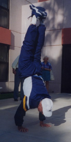 Nowadays he does five to ten handstands a day, usually in his condominium. He puts his palms flat on the ground and keeps his elbows stiff. His legs scissor up in a steady, smooth action that looks almost as easy as raising one's arms overhead. Sometimes he goes to a nearby park, gets up on a picnic table, and does a handstand on it. Children are drawn to him then, he says. They're impressed.